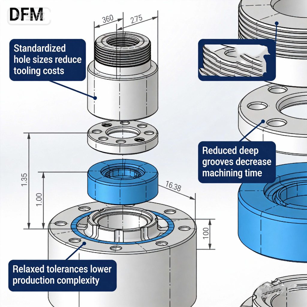 [Image: DFM illustration showing standardized hole sizes, reduced deep grooves, and relaxed tolerances marked on technical drawing with cost-saving annotations. English labels visible. Modern clean engineering style.]